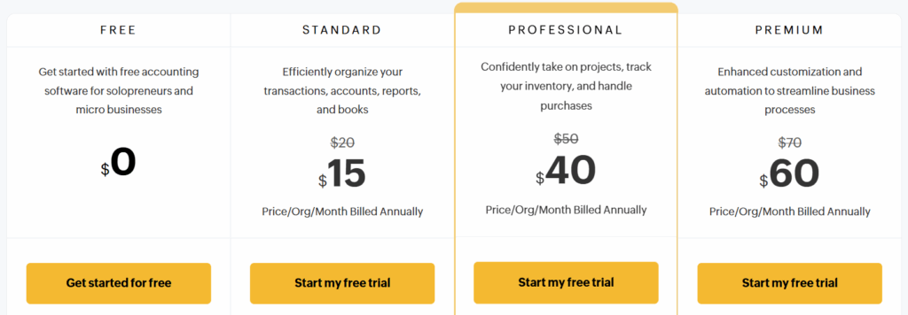 | Free | $0 / $0 | 1 + 1 accountant | 1,000/year | Invoicing, expense tracking, bank reconciliation | Freelancers, startups, side businesses |